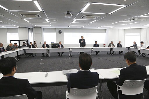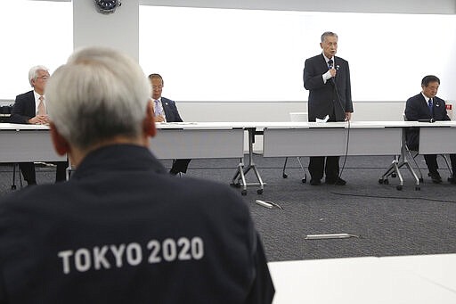 Tokyo 2020 Organizing Committee President Yoshiro Mori, center at rear, speaks during the first meeting of the “Tokyo 2020 New Launch Task Force" in Tokyo, Thursday, March 26, 2020, two days after the unprecedented postponement was announced due to the spreading coronavirus. The new Tokyo Olympics need dates for the opening and closing ceremony in 2021. Nothing moves until this is worked out by the International Olympic Committee, the Japanese government, and Tokyo organizers. (AP Photo/Koji Sasahara)