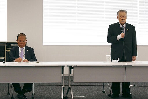 Tokyo 2020 Organizing Committee President Yoshiro Mori, right, speaks as CEO Toshiro Muto listens during the the first meeting of the “Tokyo 2020 New Launch Task Force" in Tokyo, Thursday, March 26, 2020, two days after the unprecedented postponement was announced due to the spreading coronavirus. The new Tokyo Olympics need dates for the opening and closing ceremony in 2021. Nothing moves until this is worked out by the International Olympic Committee, the Japanese government, and Tokyo organizers. (AP Photo/Koji Sasahara)