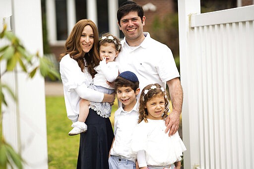 This image released by Caren Tolleth shows her husband Michael posing with their sons Gavin, 5, left, and Emmett, 9 months, at their home in Gillette, N.J. The coronavirus outbreak is having an impact on couples and their relationships. Some stay-at-home mothers say their husbands, now homebound, are finally having to see how much domestic work their spouses do. (Caren Tolleth via AP)
