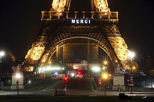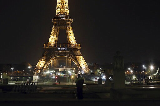 Lights spelled out “Merci," French for ‘Thank you,” and “Stay at home" in English on Friday night along with the tower's famous sparkling illuminations.