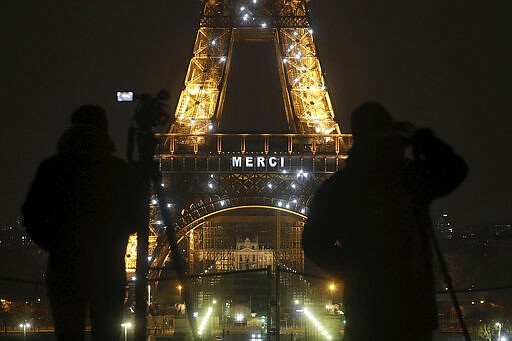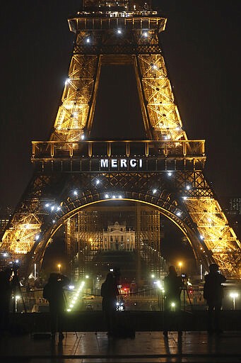 PARIS (AP) — Health workers racing to save lives as France contends with one of the world's worst coronavirus outbreaks have received a huge show of gratitude with the help of the Eiffel Tower.