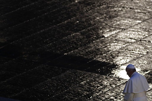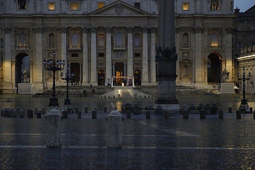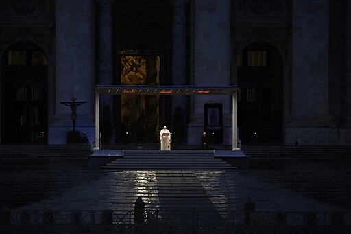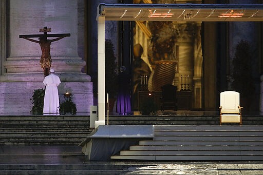 VATICAN CITY (AP) — Praying in a desolately empty St. Peter's Square, Pope Francis on Friday likened the coronavirus pandemic to a storm laying bare illusions that people can be self-sufficient and instead leaves “all of us fragile and disoriented” and needing each other's help and comfort.