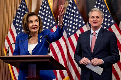 House Speaker Nancy Pelosi of Calif. accompanied by House Minority Leader Kevin McCarthy of Calif., right, speaks before signing the Coronavirus Aid, Relief, and Economic Security (CARES) Act after it passed in the House on Capitol Hill, Friday, March 27, 2020, in Washington. The $2.2 trillion package will head to head to President Donald Trump for his signature. (AP Photo/Andrew Harnik)