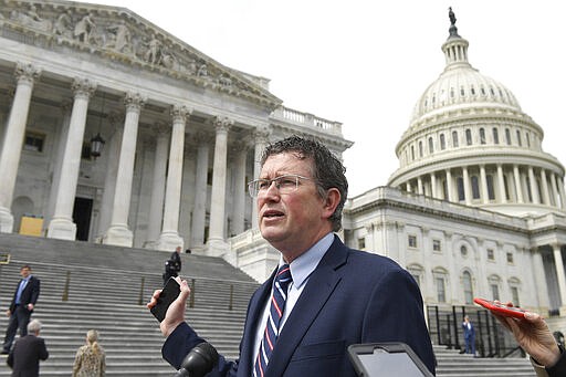 Rep. Thomas Massie, R-Ky., leaves Capitol Hill in Washington, Friday, March 27, 2020, after attempting to slow action on a rescue package. Despite Massie's effort and acting with exceptional resolve in an extraordinary time, the House rushed President Donald Trump a $2.2 trillion rescue package, tossing a life preserver to a U.S. economy and health care system left flailing by the coronavirus pandemic. (AP Photo/Susan Walsh)
