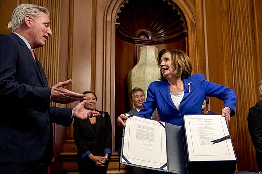 House Speaker Nancy Pelosi of Calif., right, speaks with House Minority Leader Kevin McCarthy of Calif., left, as she holds up the Coronavirus Aid, Relief, and Economic Security (CARES) Act after signing it on Capitol Hill, Friday, March 27, 2020, in Washington. The $2.2 trillion package will head to head to President Donald Trump for his signature. (AP Photo/Andrew Harnik)