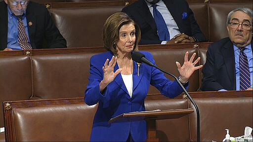 In this image from video, House Speaker Nancy Pelosi of Calif., speaks on the floor of the House of Representatives at the U.S. Capitol in Washington, Friday, March 27, 2020. (House Television via AP)