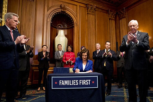 House Speaker Nancy Pelosi of Calif., accompanied by House Minority Leader Kevin McCarthy of Calif., left, House Majority Leader Steny Hoyer of Md., right, and other bipartisan legislators, signs the Coronavirus Aid, Relief, and Economic Security (CARES) Act after it passed in the House on Capitol Hill, Friday, March 27, 2020, in Washington. The $2.2 trillion package will head to head to President Donald Trump for his signature. (AP Photo/Andrew Harnik)