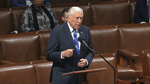 In this image from video, House Majority Leader Steny Hoyer of Md., speaks on the floor of the House of Representatives at the U.S. Capitol in Washington, Friday, March 27, 2020. (House Television via AP)