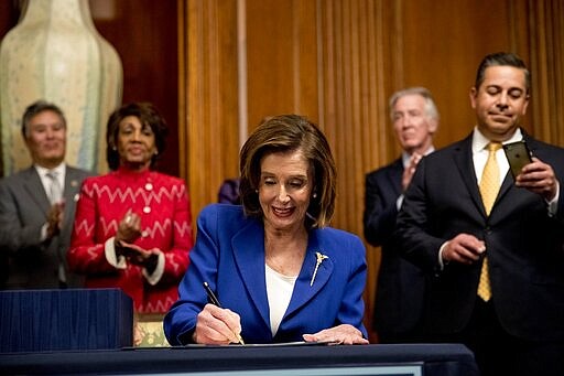 House Speaker Nancy Pelosi of Calif., accompanied by bipartisan legislators, signs the Coronavirus Aid, Relief, and Economic Security (CARES) Act after it passed in the House on Capitol Hill, Friday, March 27, 2020, in Washington. The $2.2 trillion package will head to head to President Donald Trump for his signature. (AP Photo/Andrew Harnik)
