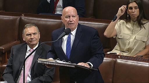 In this image from video, Rep. Kevin Brady, R-Texas, speaks on the floor of the House of Representatives at the U.S. Capitol in Washington, Friday, March 27, 2020. (House Television via AP)