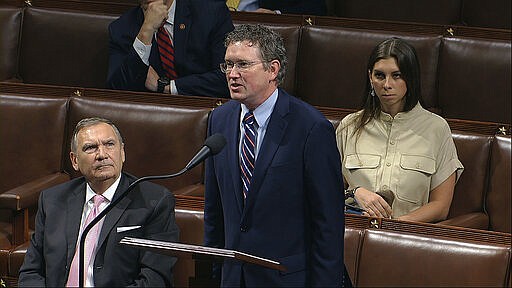 In this image from video, Rep. Thomas Massie, R-Ky., speaks on the floor of the House of Representatives at the U.S. Capitol in Washington, Friday, March 27, 2020. (House Television via AP)
