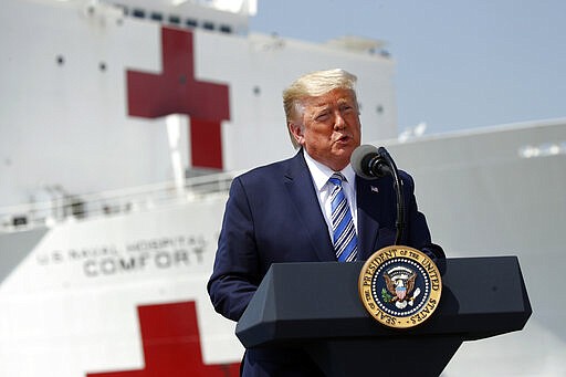President Donald Trump speaks in front of the U.S. Navy hospital ship USNS Comfort at Naval Station Norfolk in Norfolk, Va., Saturday, March 28, 2020. The ship is departing for New York to assist hospitals responding to the coronavirus outbreak. (AP Photo/Patrick Semansky)