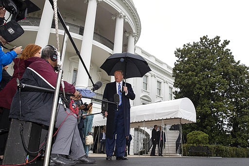 President Donald Trump speaks about the coronavirus as he walks to Marine One to depart the White House, Saturday, March 28, 2020, in Washington. Trump is en route to Norfolk, Va., for the sailing of the USNS Comfort, which is headed to New York. (AP Photo/Alex Brandon)