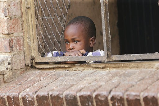 A child looks out from a balcony in a block of flats in Harare, Zimbabwe, Monday March, 30, 2020. Zimbabwe went into a lockdown for 21 days in an effort to curb the spread of the coronoavirus. The new coronavirus causes mild or moderate symptoms for most people, but for some, especially older adults and people with existing health problems,it can cause more severe illness or death. (AP Photo/Tsvangirayi Mukwazhi)