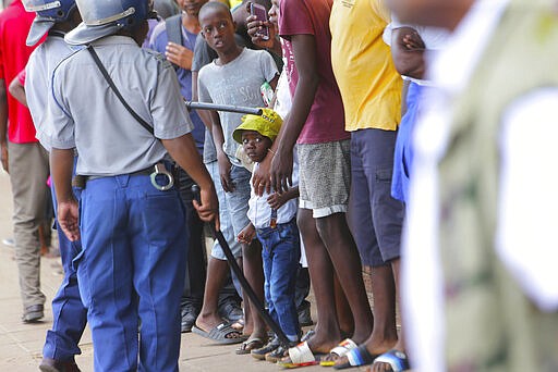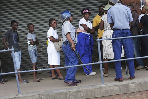 Zimbabwean police encourage people to practice social distancing to prevent the spread of coronoavirus while in a queue to enter a supermarket in Harare, Zimbabwe, Monday, March, 30, 2020. Zimbabwe went into a lockdown for 21 days in an effort to curb the spread of the coronoavirus. The new coronavirus causes mild or moderate symptoms for most people, but for some, especially older adults and people with existing health problems, it can cause more severe illness or death. (AP Photo/Tsvangirayi Mukwazhi)