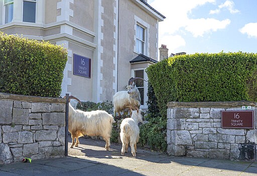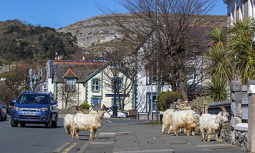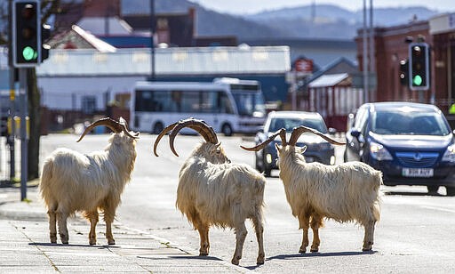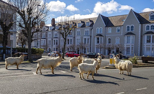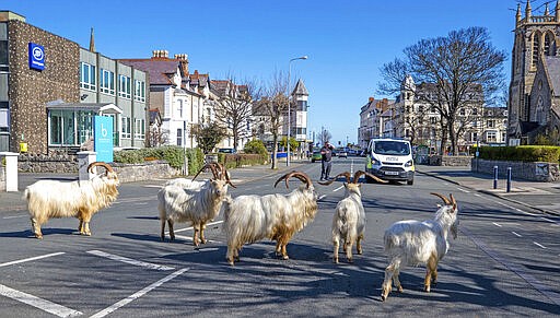 With humans sheltering indoors to escape the new coronavirus, mountain goats are taking advantage of the peace and space to roam in frisky clumps through the streets of Llandudno, a town in North Wales.