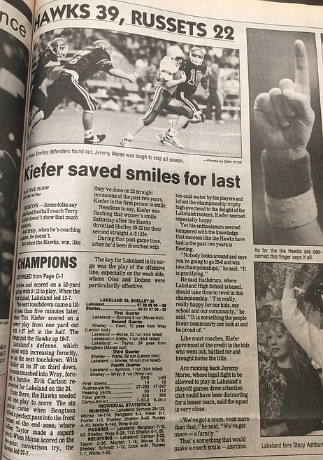 LAKELAND BROKE through for its first state title in 1988, beating Jerome 13-12 in the A-2 title game at Holt Arena in Pocatello to finish 11-1. The game-winning PAT was booted late in the game by Jason Galbraith, a lineman with a square-toed kicking shoe. He was normally the Hawks’ kickoff guy, but was pressed into point-after duty when Jeremy Morse fell ill.
