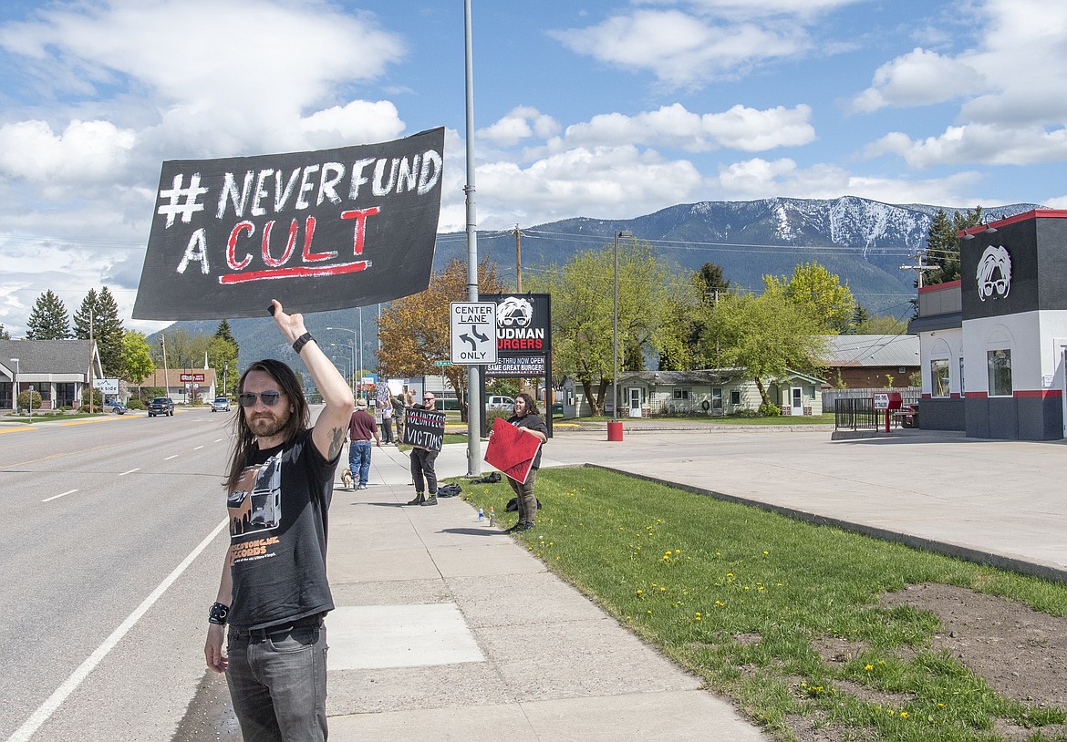 A group of protesters gathered in front of MudMan Burgers in Columbia Falls on Sunday to rally against the restaurant’s relaunch. The group held up signs with various messages including “Workers Drug Thru Mud,” “Never Fund a Cult” and “Forced Labor = Slavery.”