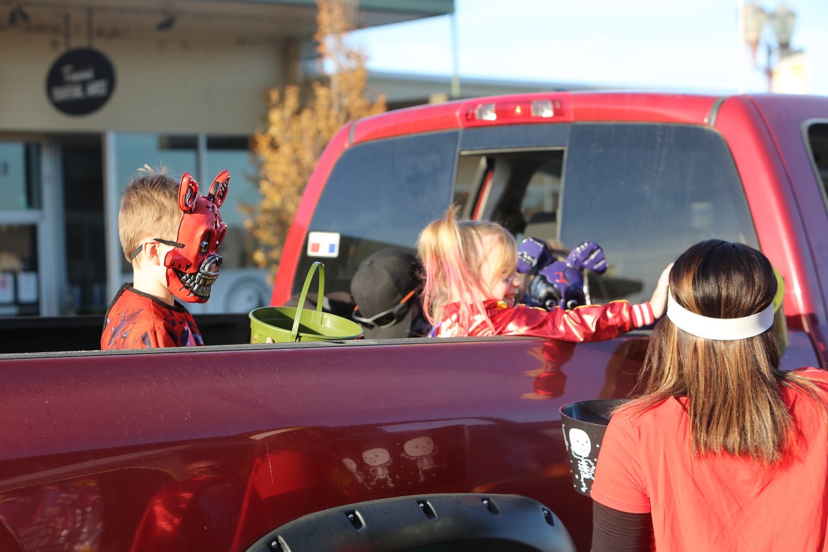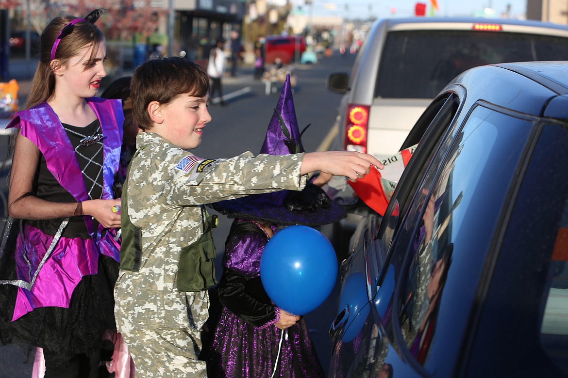 As families cruised slowly through downtown, volunteers with local organizations like Grant Transit Authority, New Hope and Grant County Fire District No. 5, or local businesses like Brookdale Hearthstone and Help-U-Sell popped handfuls of sweets into the outstretched buckets and pillowcases of local trick-or-treaters.