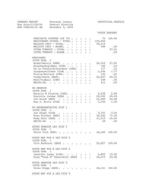 While the country waits anxiously to see which direction America’s election results tilt, the last unofficial results in Kootenai County eliminated any last-minute surprises here.