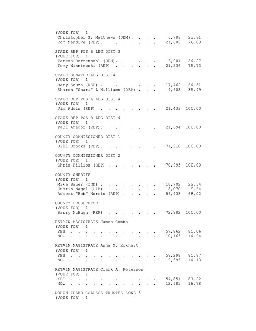When the last batch of results from Tuesday’s election came through at 2:31 a.m. Wednesday from the Kootenai County Elections Office, incumbent Mary Souza’s lead over Democrat Shari Williams for the District 4 Senate seat more than tripled to a 7,854 margin. The incumbent went to bed Tuesday night with a modest 1,845-vote lead and woke up with more than 8,000 new votes in her favor and a 29-point victory.