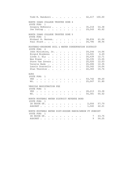 The only race that was statistically still in question before the clock struck midnight Tuesday was NIC Zone 4 trustee position. Greg McKenzie, one of three trustee candidates to receive an endorsement from the Kootenai County Republican Central Committee, went to sleep Tuesday night with a 1,666-vote lead over Dr. Joe Dunlap. By sunrise, that lead had swelled to 5,675, with no looking back.