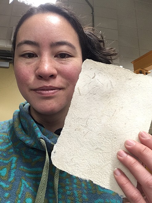 Using a food processor, Zee was able to pulp the fibers and a paper press to sift through the pulp and form sheets, which are then dried with a hot press.