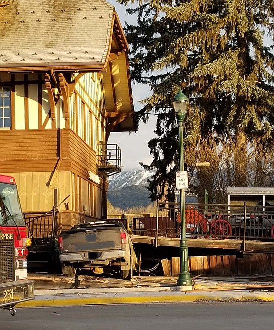 Law enforcement officials are investigating a Sunday morning vehicle crash that heavily damaged the wood deck around the historic Whitefish Train Depot downtown.