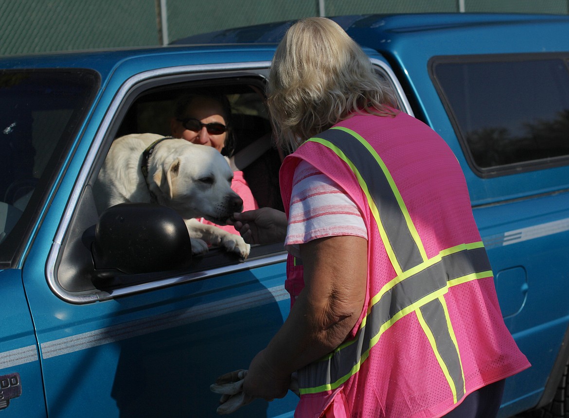 Sure enough, when Russ drives up on a late Friday morning, his dog Lucy pops her head out the back window. Ahlers reaches into the pocket of her pink reflective safety vest and pulls out a treat, which she sets on the seat for Lucy. Lucy ducks down to eat, disappearing from view.