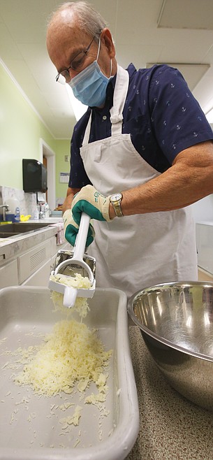 On a Wednesday morning at Trinity Lutheran Church, these four boil (about 30 minutes until soft), peel (with knives, wearing gloves because they’re hot) and grate the potatoes (looks like rice when it comes out of the handheld grater). Before they’re done, that will be 300 pounds over two days.