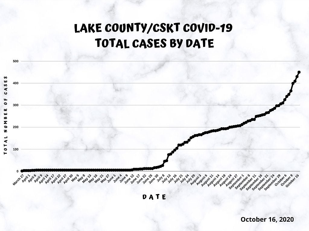 The county’s first pandemic-related death came in late July. In that case the deceased was a man in his 70s who died in a Flathead County hospital. At the time of his death the county had 131 confirmed cases. On Tuesday Lake County Public Health announced a total of 508 confirmed cases.