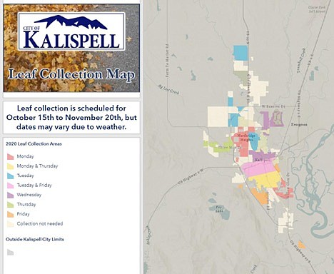 An interactive leaf collection map is available on the city’s website at www.kalispell.com/265/Leaf-Removal. The map provides information on weekday collection areas. City residents can use the map to search their address and determine their area’s leaf collection day.