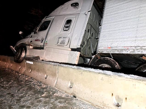 Despite the dangerously precarious position of the vehicle, the two male occupants of the semi-truck were found to be OK. Only the passenger, who was sleeping in the sleeper cab at the time of the incident, received minor lacerations to his hand and abrasions to his shoulder and abdomen area.
