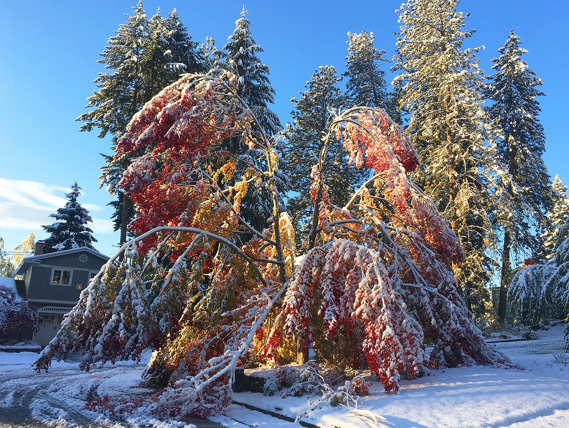 It caused scores of slideoffs and accidents on highways. Trees and branches came down early Saturday throughout North Idaho. Larger branches took down power lines, blocked roads, crushed fences, covered cars and damaging roofs. Sherman Avenue was littered with fallen trees branches.