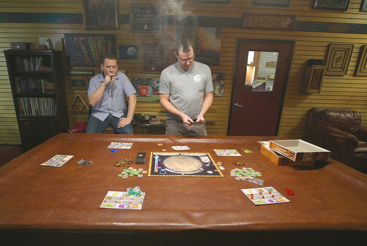 On a Thursday afternoon, two men sit at a table and chat over cigars, while two others set up the game "Terraforming Mars" on the cover of the pool table.