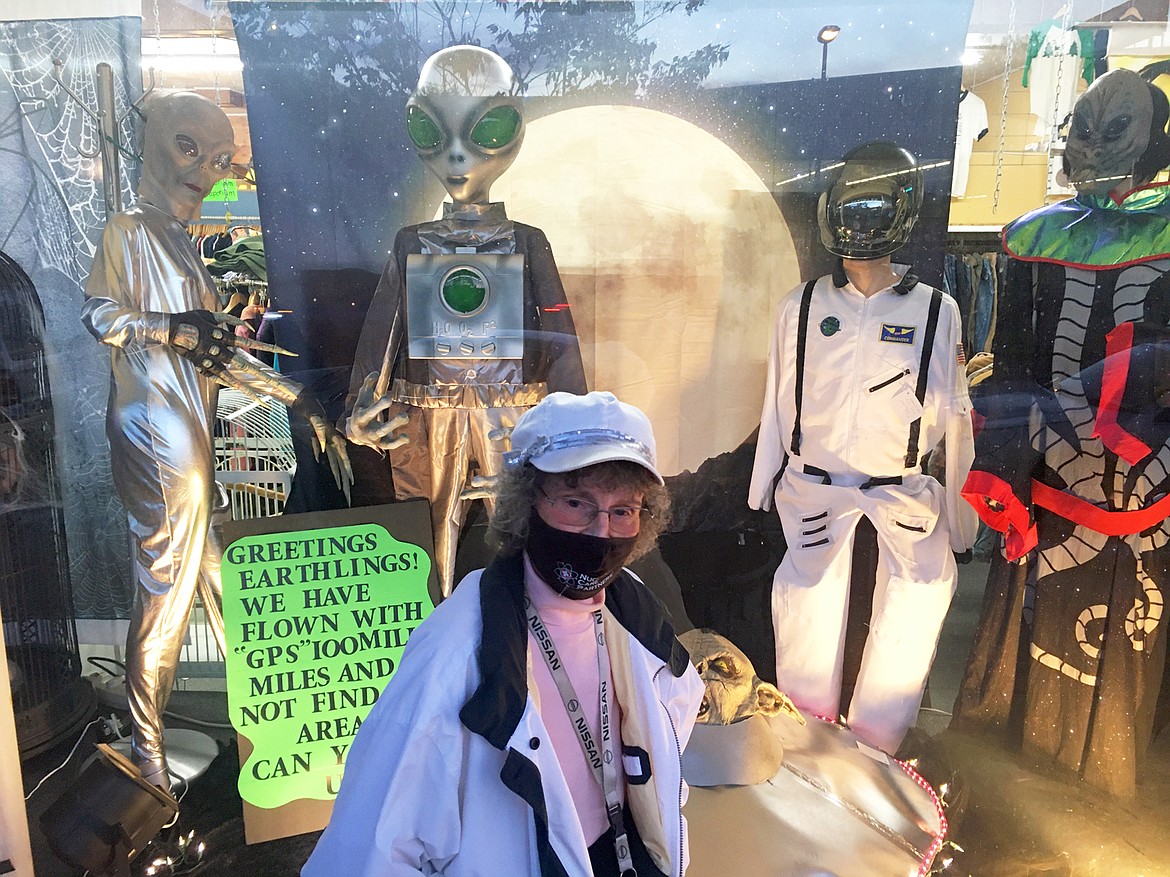 “Last year I had a few alien costumes and they sold real good, so I thought I’d do a window of aliens,” she said.