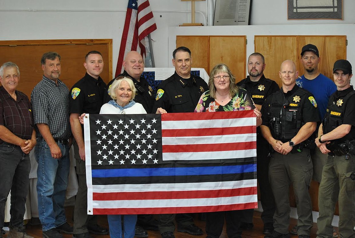 During the afternoon’s festivities Sheriff Toth and his deputies were presented with a token of gratitude from Lynette Walters and Susan Charles of the Old DeBorgia Schoolhouse Foundation, Frank McGee of the West End Volunteer Fire and Rescue Board, and County Commissioner Duane Simons. A Thin Blue Line Police Flag was given to Toth and the other deputies. The flag is said to represent police solidarity and support of law enforcement.