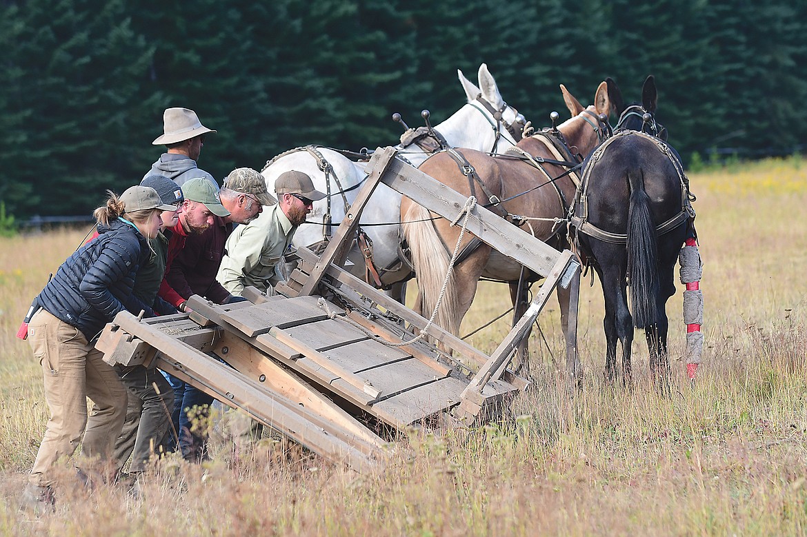 To begin the project, a wooden box grader, necessary for the first few passes in smoothing the runway, had to be built. Flint’s son Jim, fire management officer for the Spotted Bear Ranger District, was able to replicate one from historic design plans shared by the Rocky Mountain Ranger District Station out of Choteau. The box grader consists of a heavy-timbered frame with large metal spikes at the front used as teeth to break up the soil and bars of flat steel behind to flatten the roughed-up ground. The hefty implement weighs about a ton once a crew of three drivers sits atop, and is dragged, with full resistance, behind a straining team of mules. It takes a crew of three to run the the team pulling the implements: Zoellner the skinner, who manned the reins and gave voice commands; Milone the whipper, who tapped and guided the mules with a long willow bole to reinforce the commands; and Rust the tripper, who held the line to “e-brake” the whole operation if necessary.