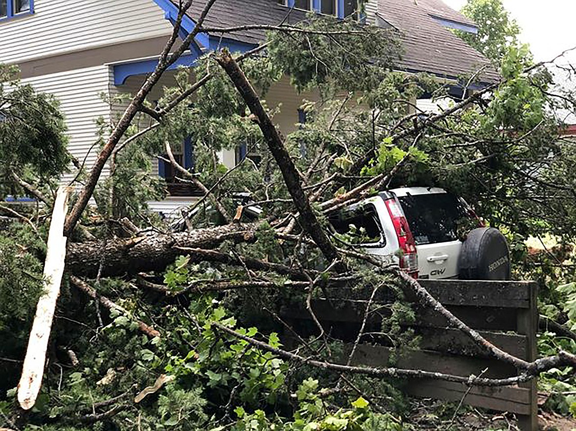 Larry Stone noticed the winds had sent his barbecue cover sailing and headed out to look for it, figuring he’d find it caught up against a nearby fence or tree. By the time he returned to his Jefferson Avenue home, the winds had sent a dangling tree top — broken off earlier in the storm — crashing downward, just hitting the eaves of his home, causing minor damage.