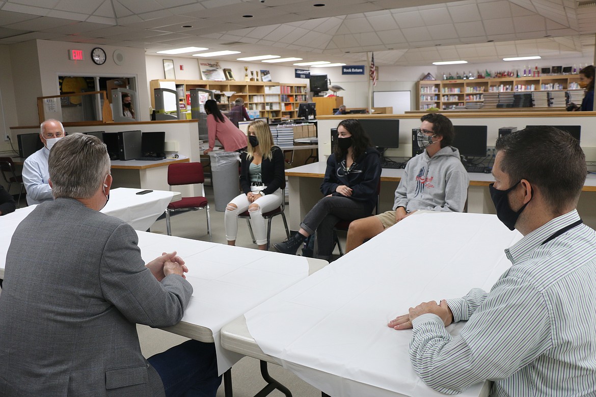 SHS seniors Connor Bird, Baxter Pollard and Autumn Morgan told the governor that the biggest change is the shortened school day and not seeing as many people as they are used to seeing.
