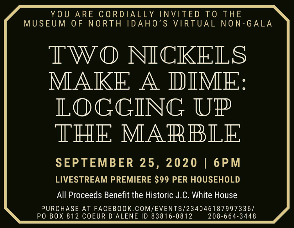 The cost of attendance for “Two Nickels Make a Dime” is $99 per household. Tickets will be sold through Facebook, though attendees not wishing to view the Facebook Live event can call the museum at 208-664-3448 to purchase tickets and experience the play through alternate viewing means. The museum is also accepting payment by check through the mail at P.O. Box 812, Coeur d’Alene, ID 83816-0812, or by visiting the museum’s current location at 115 Northwest Blvd. in Coeur d’Alene.