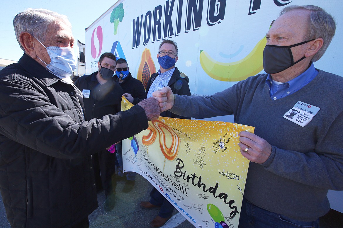 About 30 Safeway associates, some wearing colorful party hats, were part of the crowd that welcomed Mitchell like they were old friends.