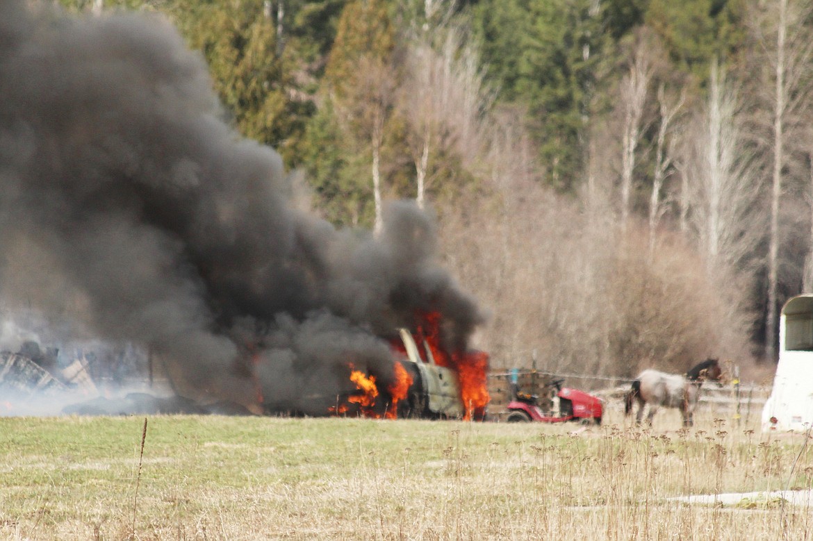 The fire investigator determined yesterday that the fire was caused by a heat lamp in the barn that was being powered by an extension cord from the house. It was a clip-on heat lamp with an aluminum shroud, which may have fallen from where it was mounted.