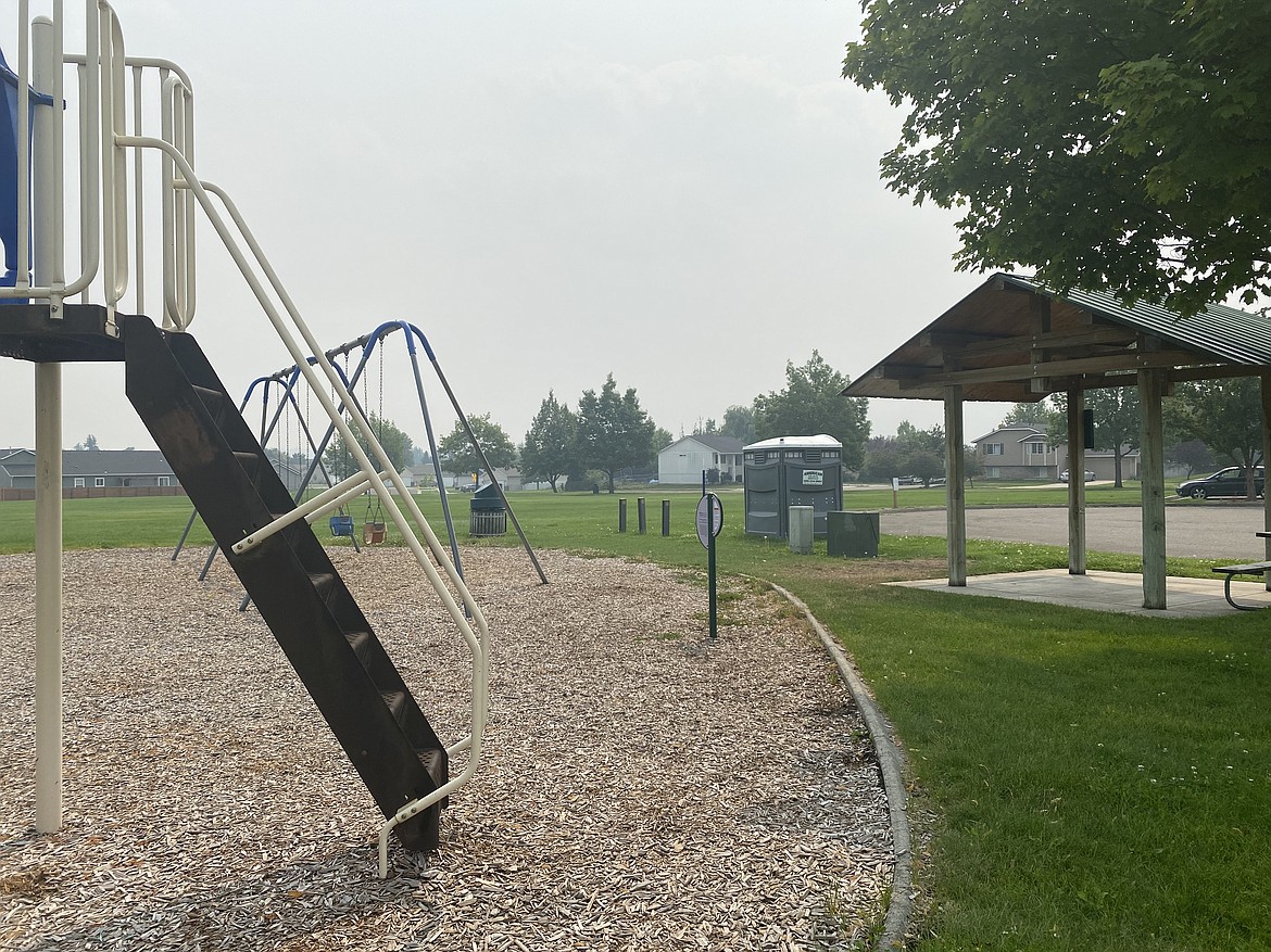 The Singing Hills playground sits in the middle of the Harmony Place neighborhood, off Idaho Street. For now, dogs are prohibited on the property, which consists of a large open playing field, an aging playground space, a small covered pavilion and one porta-potty.