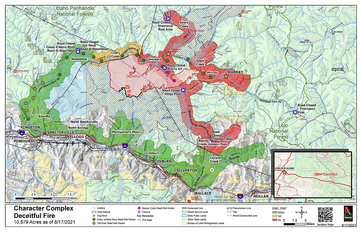 As of press time, areas under Level 2 evacuation status include the Coal Creek Community, from the Coeur d’Alene River Road mile marker 13 (east of Castle Rock) to mile marker 18.