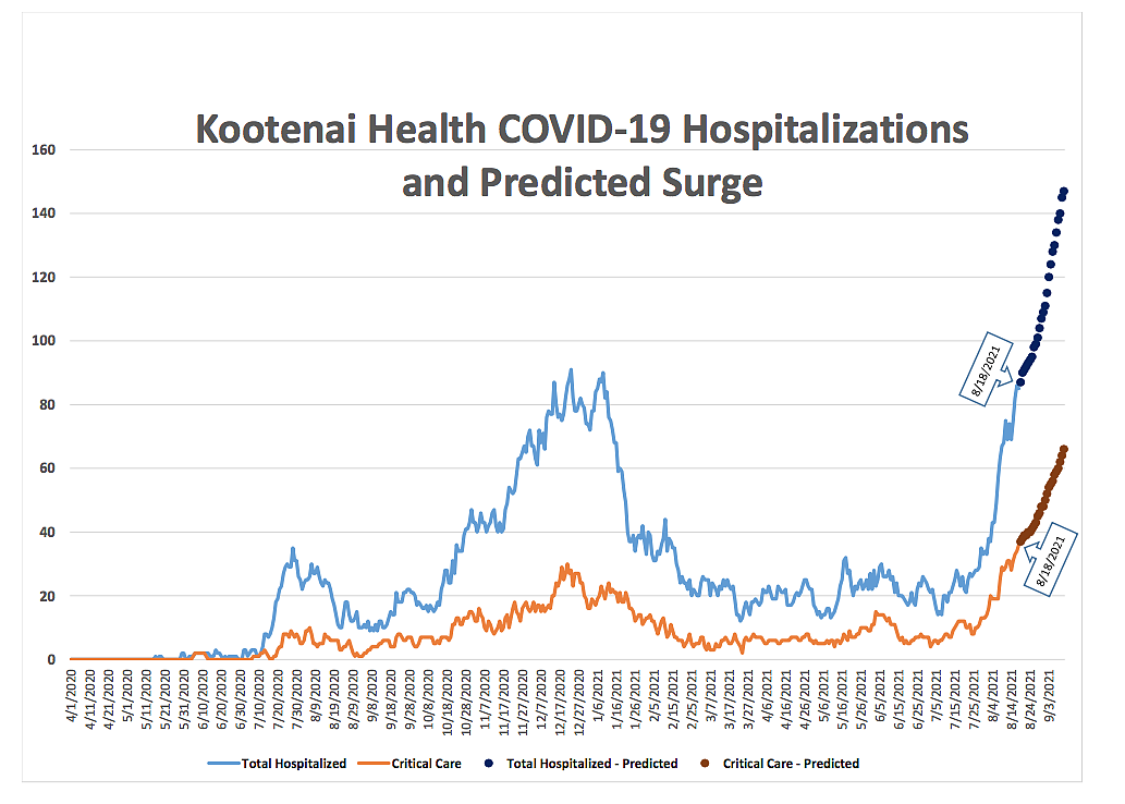 On July 28, Kootenai Health had 29 COVID-19 patients with 11 of those patients requiring critical care. On Aug. 4, those numbers were 43 and 19. On Aug. 11, they were 73 and 29, and on Aug. 18, they were 85 and 36.