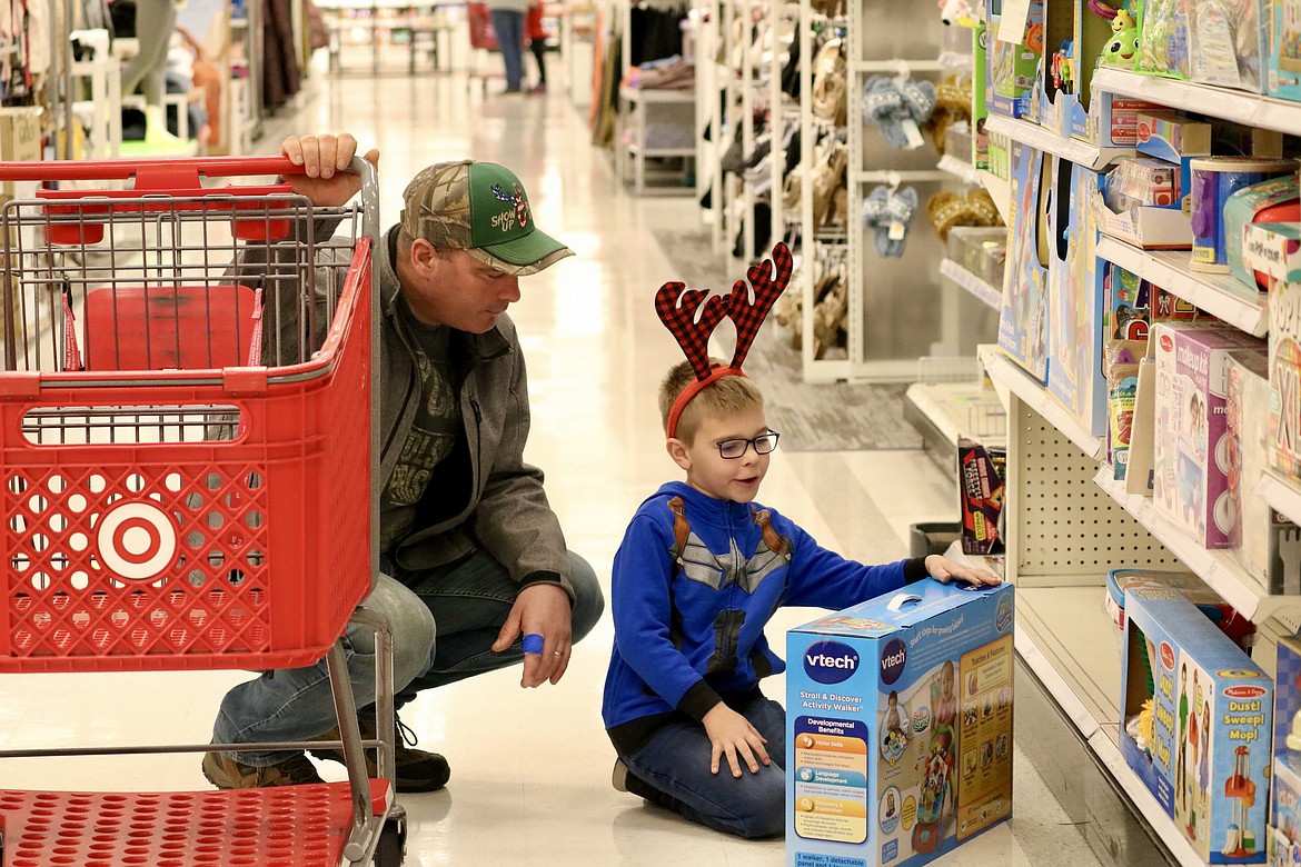 Six-year-old Keith was having fun picking out toys for his family with the assistance of his buddy, Sgt. First Class Nick Blankenship.