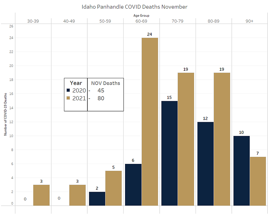 Kootenai County has had 474 deaths attributed to the coronavirus, with 6 of those, 1.3%, people under the age of 40. Most deaths, 429, or 90%, were those age 60 and older.