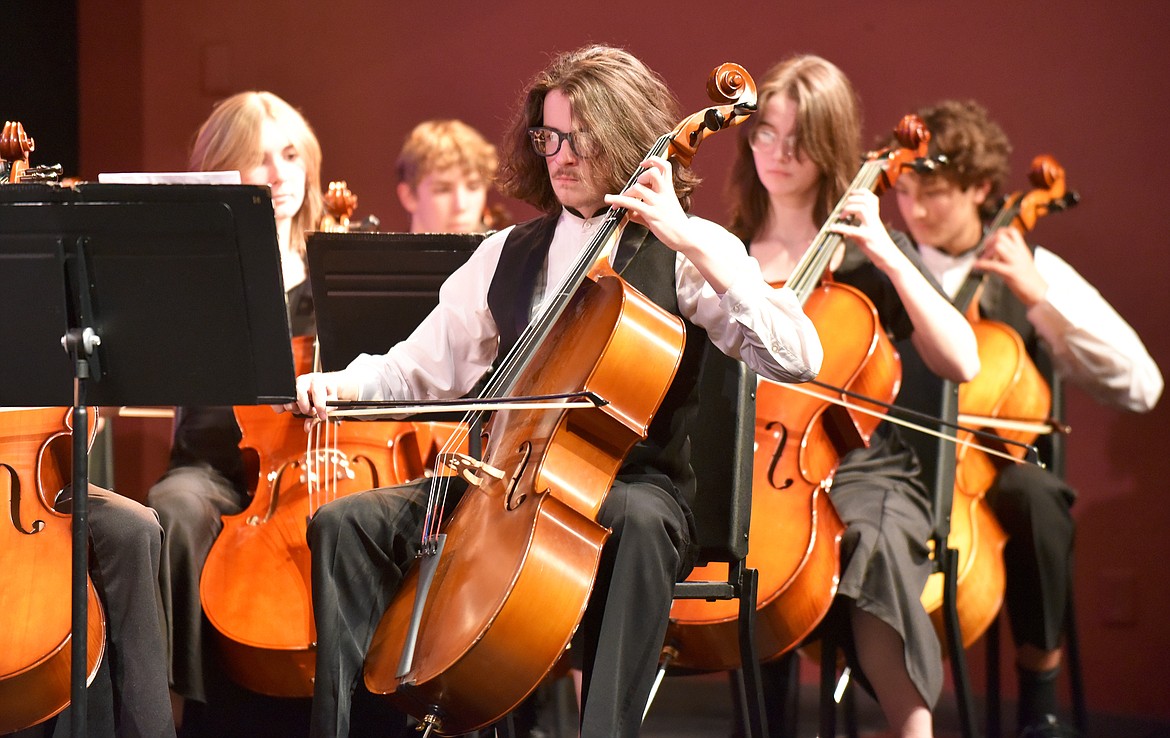 Whitefish senior Fin Stagg performs with the high school orchestra during the holiday concert on Dec. 7 at the Whitefish Performing Arts Center. (Whitney England/Whitefish Pilot)