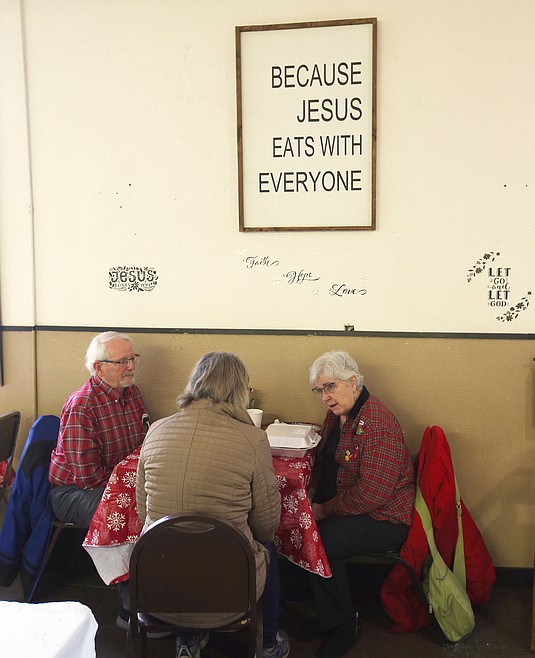 “We wanted to be around people,” Ginger Wright said as she and Ken, retired educators, chatted with Nancy Tolley, also an educator. “The opportunity to share food with other people at Christmas time is always kind of first and foremost in our lives.”